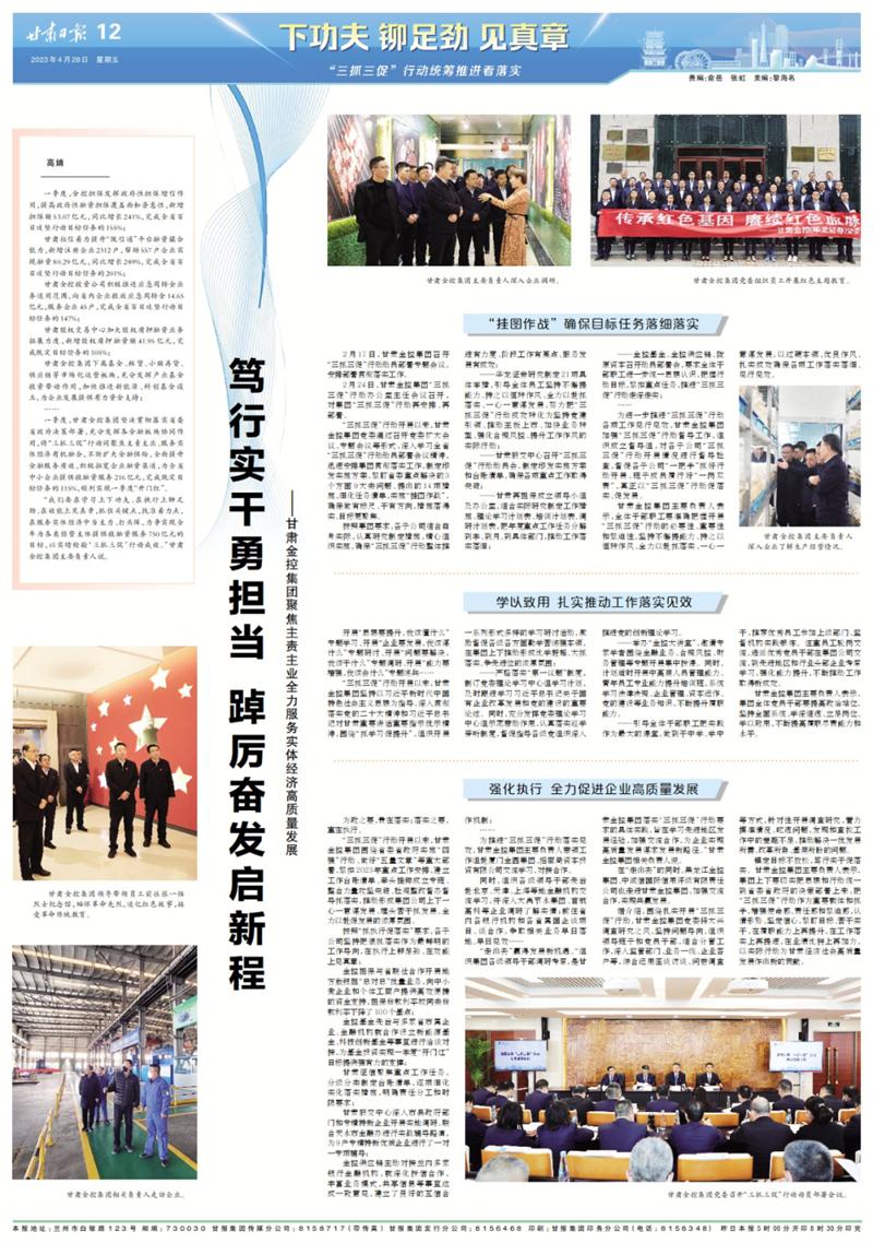“三抓三促”行動(dòng)開展以來,甘肅金控集團(tuán)圍繞省委省政府實(shí)施“四強(qiáng)”行動(dòng)、做好“五量文章”等重大部署,緊扣2023年重點(diǎn)工作安排,建立工作臺賬清單、牽頭掛帥成立專班、整合力量攻堅(jiān)突破、檢視整改督辦督導(dǎo)抓落實(shí),推動(dòng)形成集團(tuán)公司上下一心一意謀發(fā)展、埋頭苦干抓發(fā)展、全力以赴促發(fā)展的濃厚氛圍。