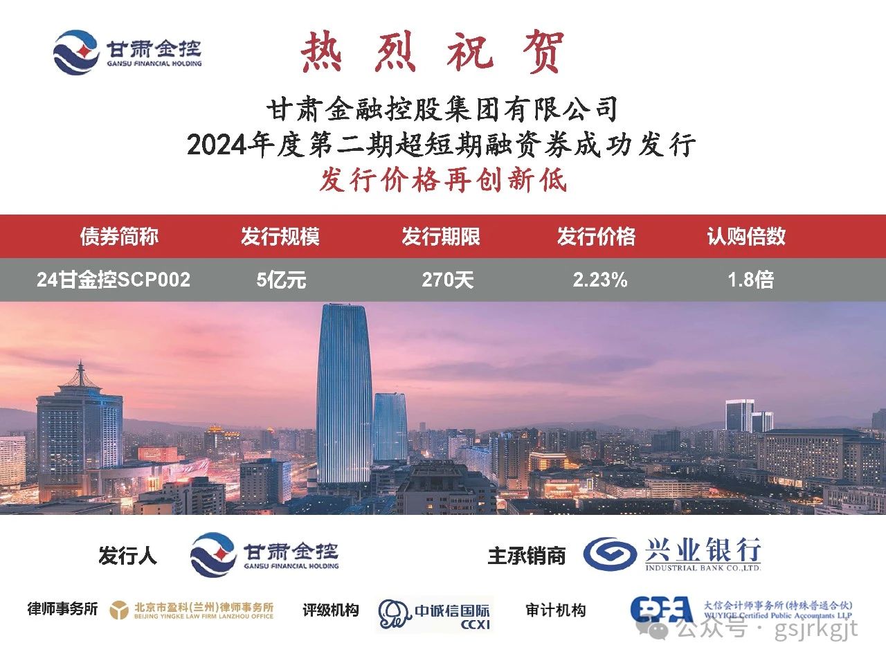 2024年6月4日,甘肅金融控股集團(tuán)有限公司成功發(fā)行2024年度第二期超短期融資券,發(fā)行規(guī)模5億元,債券期限270天,票面利率2.23%,再創(chuàng)發(fā)行超短期融資券利率新低。