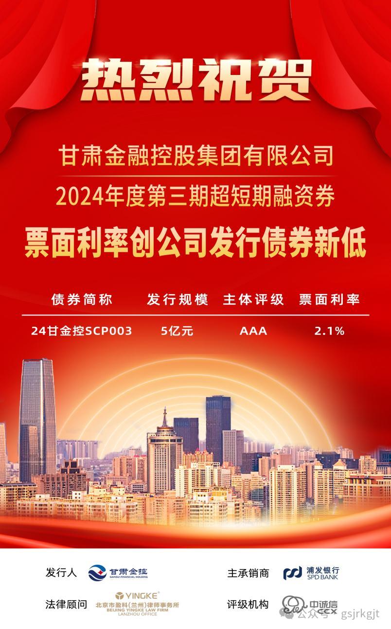 2024年8月15日,甘肅金融控股集團(tuán)有限公司成功發(fā)行2024年度第三期超短期融資券,發(fā)行規(guī)模5億元,債券期限270天,票面利率2.10%,創(chuàng)公司發(fā)行債券新低。