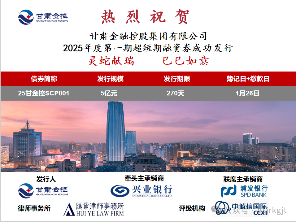 2025年1月26日,甘肅金控集團(tuán)成功發(fā)行2025年度第一期超短期融資券,規(guī)模5億元,期限270天。本筆項目是乙巳蛇年春節(jié)前全國最后一筆公開發(fā)行債券,受到了交易商協(xié)會、北金所、市場投資人的特別關(guān)注,有力提高了集團(tuán)的市場知名度,也為集團(tuán)后續(xù)債券發(fā)行開了好頭!