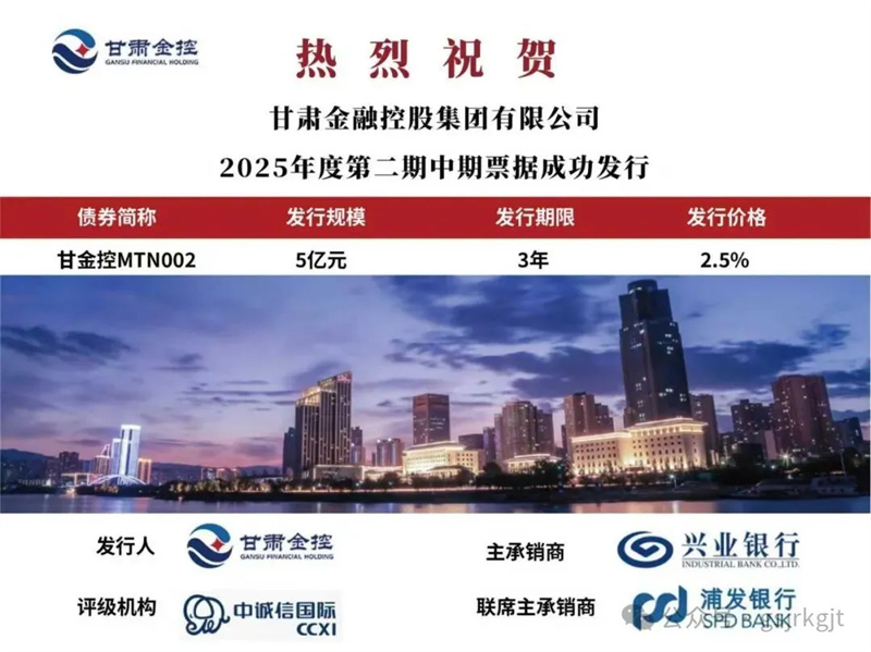 2025年10月17日,甘肅金控集團成功發(fā)行2025年度第二期中期票據(jù)。發(fā)行規(guī)模5億元,期限3年,票面利率2.5%。票據(jù)發(fā)行過程中,吸引了多家商業(yè)銀行、信托公司等機構(gòu)投資者積極參與,充分體現(xiàn)了資本市場對甘肅金控集團綜合實力、戰(zhàn)略布局和發(fā)展前景的認可,本次中期票據(jù)發(fā)行成功為集團的持續(xù)發(fā)展提供有力的資金保障。