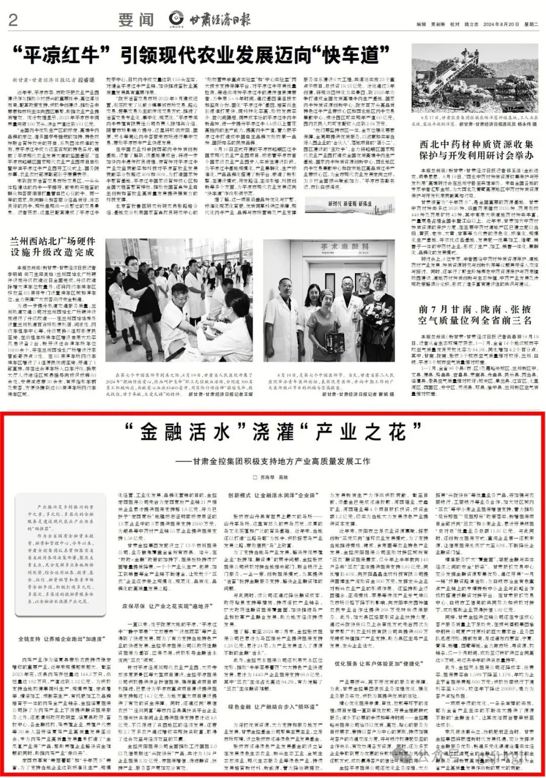 作為全省國有金融資本投資、融資和管理中心,今年以來,甘肅金控集團認真貫徹落實省委省政府各項決策部署,聚焦主責主業(yè),充分發(fā)揮多業(yè)務板塊協(xié)同優(yōu)勢,綜合運用證券、投資、基金、征信、融資租賃和要素市場等金融手段,積極打造多元化、多層次、多渠道的投融資服務體系,以金融活水澆灌產(chǎn)業(yè)之花。