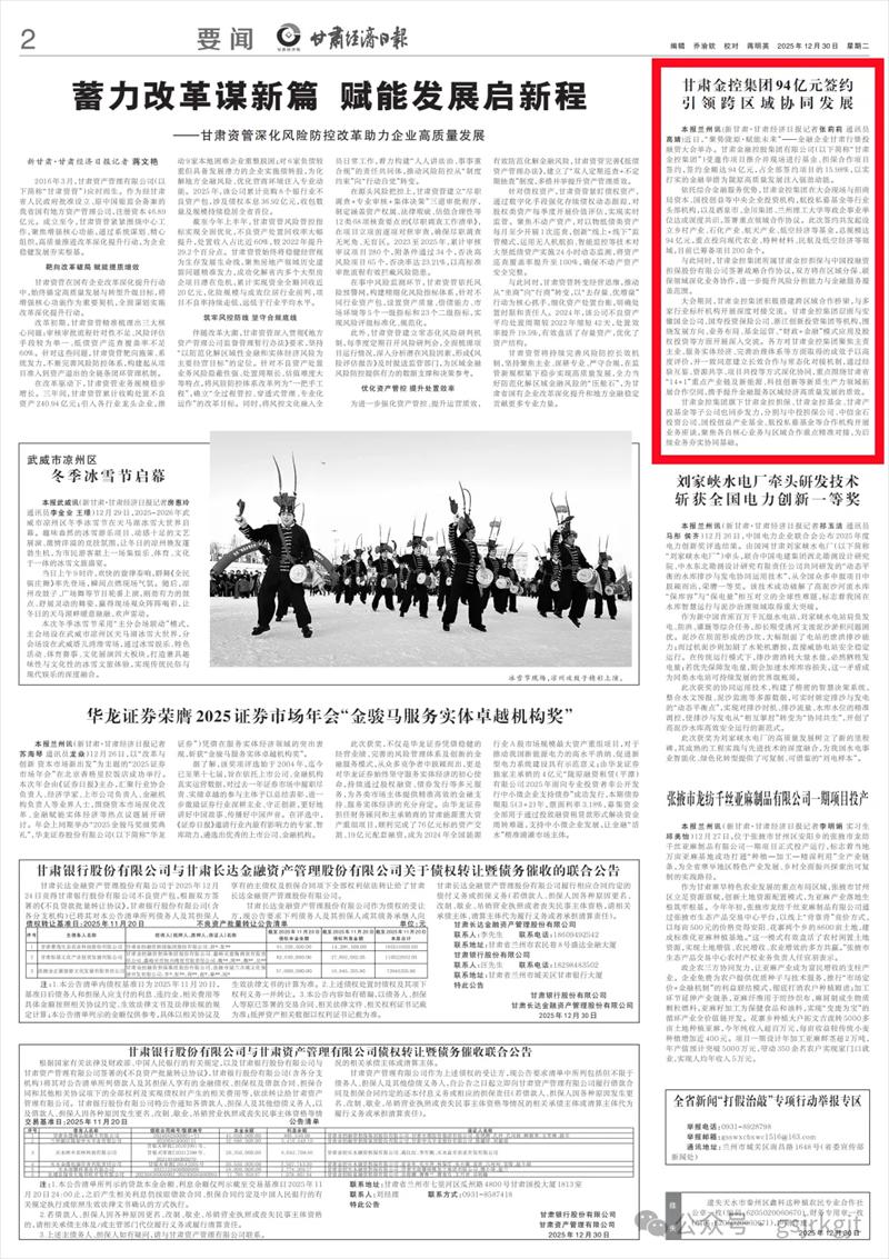 (新甘肅·甘肅經(jīng)濟(jì)日?qǐng)?bào)記者張莉莉 通訊員 高婧)近日,“聚勢(shì)隴原·賦能未來(lái)”——金融企業(yè)甘肅行暨投融資大會(huì)舉辦。甘肅金融控股集團(tuán)有限公司(以下簡(jiǎn)稱(chēng)“甘肅金控集團(tuán)”)受邀作項(xiàng)目推介并現(xiàn)場(chǎng)進(jìn)行基金、擔(dān)保合作項(xiàng)目簽約,簽約金額達(dá)94億元,占全部簽約項(xiàng)目的15.98%,以實(shí)打?qū)嵉慕鹑谂e措為隴原高質(zhì)量發(fā)展注入強(qiáng)勁動(dòng)能。