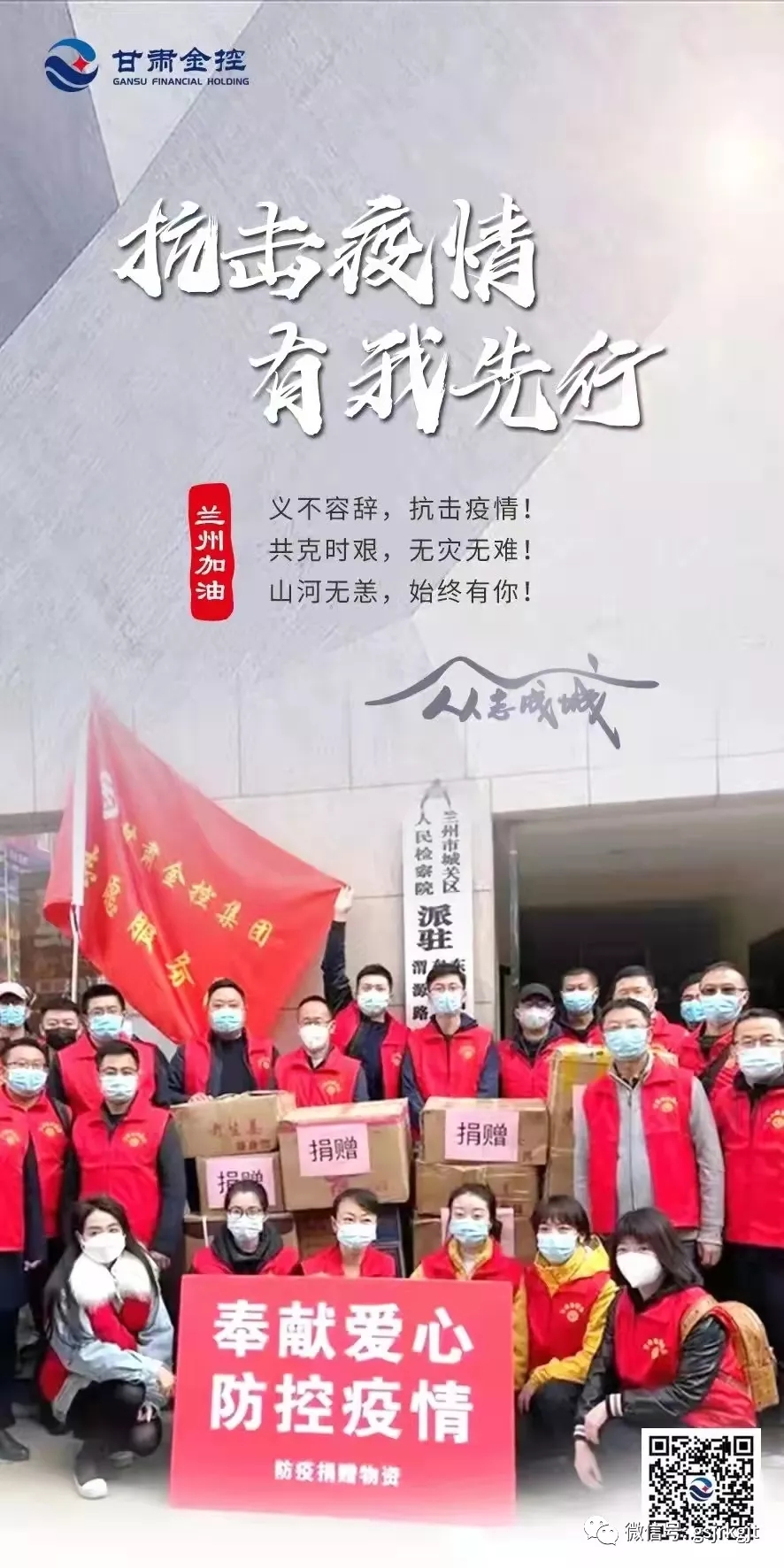 十月的金城,還沒(méi)來(lái)得及走出國(guó)慶的喜悅,突襲而至的“德?tīng)査辈《咀屨麄€(gè)城市按下了“暫停鍵”,車(chē)水馬龍的蘭州市顯得格外靜寂,美麗的黃河之濱也略失姿色,唯有滿(mǎn)城鮮紅的黨旗給人以信念,白衣鎧甲的逆行者給人以信心,“蘭州加油、抗疫必勝”的強(qiáng)音不斷響徹金城大地。十月“抗疫之戰(zhàn)”打響以來(lái),全省各行各業(yè)主動(dòng)扛起責(zé)任,醫(yī)護(hù)人員晝夜奮戰(zhàn)、公安民警奮勇當(dāng)先,國(guó)企勇挑重?fù)?dān),民企積極出力,科研人員奮力攻關(guān),黨員干部投身志愿一線(xiàn),全城的每一個(gè)人都在竭盡全力為抗疫貢獻(xiàn)自己的一份力量,共同描繪著一幅同舟共濟(jì)的抗疫畫(huà)卷。隴原融資租賃公司就是這其中的一支隊(duì)伍,在甘肅金控集團(tuán)黨委的堅(jiān)強(qiáng)領(lǐng)導(dǎo)下,全體員工積極服從疫情防控大局需要,全力夯實(shí)金融支持疫情防控堅(jiān)強(qiáng)后盾,主動(dòng)投身疫情防控的嚴(yán)峻斗爭(zhēng)中。