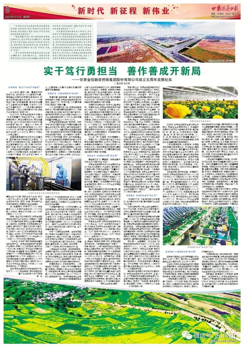 風(fēng)雨兼程里銘刻奮發(fā)向上的印記,守正創(chuàng)新中開啟奮楫揚帆的遠征。自2018年5月成立以來,甘肅金控融資擔(dān)保集團股份有限公司深入貫徹落實國家和省委省政府政策要求,按照甘肅金融控股集團有限公司工作部署,充分發(fā)揮政府性融資擔(dān)保作用,積極健全政府性融資擔(dān)保體系,進一步拓寬小微企業(yè)和“三農(nóng)”主體融資渠道,服務(wù)全省重大戰(zhàn)略、重要產(chǎn)業(yè)、重點項目,以覆蓋全省的融資擔(dān)保服務(wù)匯聚起惠企強農(nóng)的磅礴力量,走出了一條具有甘肅特色的政府性融資擔(dān)保路徑。