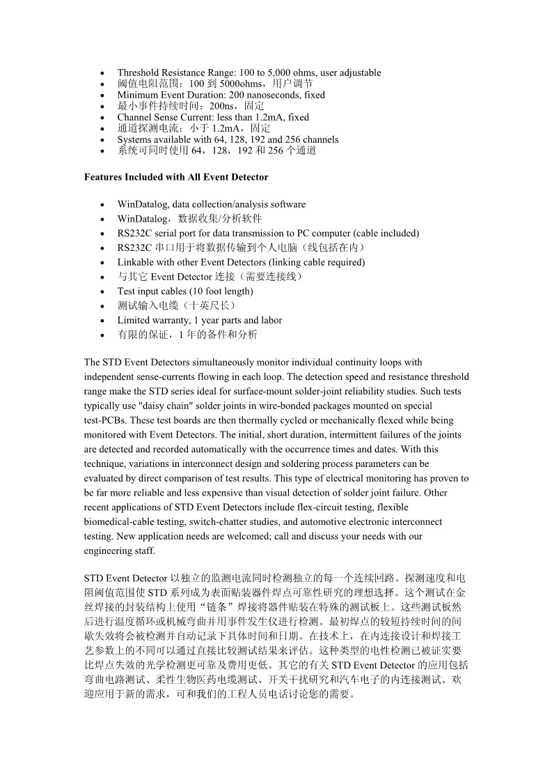 STD系列Event Detector提供源于表面貼裝焊點(diǎn)可靠性測試需要的測試規(guī)范。像別的Event Detector一樣,這臺(tái)設(shè)備能夠根據(jù)這些電測試規(guī)范用于測試其它類型的內(nèi)連接,STD系列對一個(gè)選定的閾值電阻提供穩(wěn)定的電阻檢測。